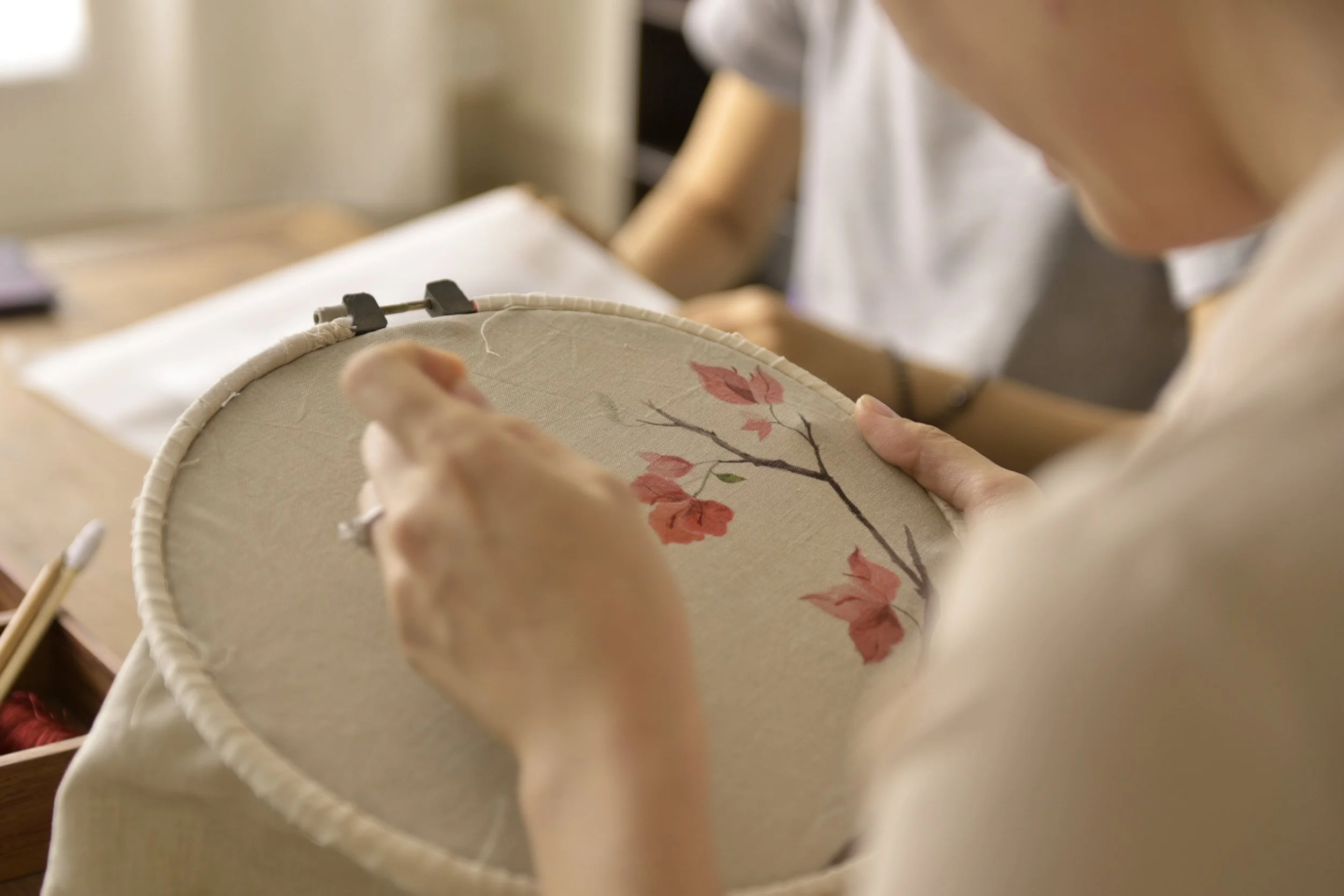 At our Cẩm Giang workshop, time moves differently. Here, skilled hands guided by master craftspeople—many trained in the exacting traditions of Japanese kimono embroidery—dedicate themselves to the meticulous art of textile creation. Each piece requires weeks, sometimes months, of patient work. Every stitch, every painted detail, every carefully chosen thread represents hours of focused attention, of love made manifest.